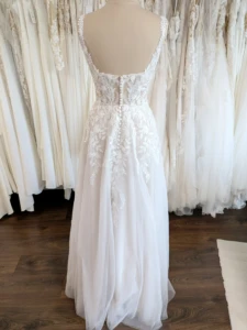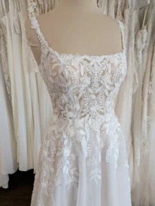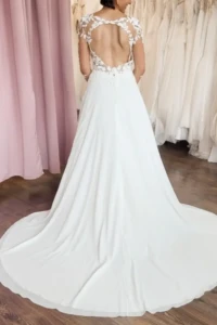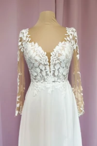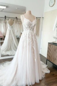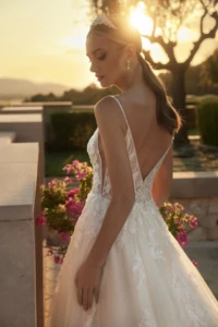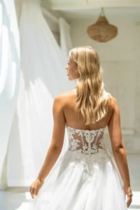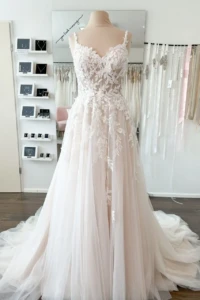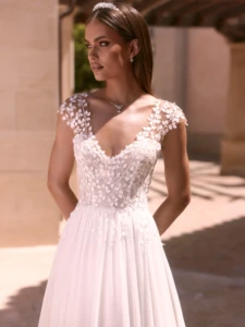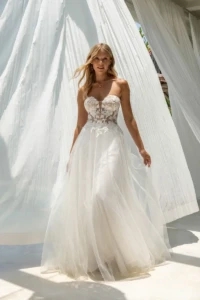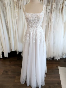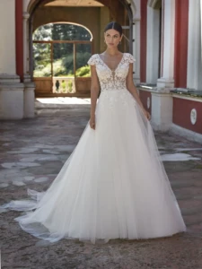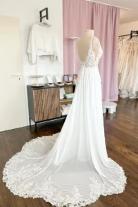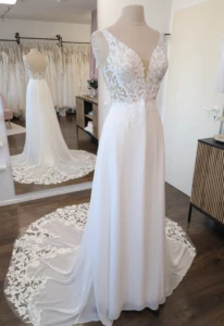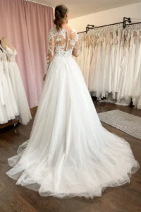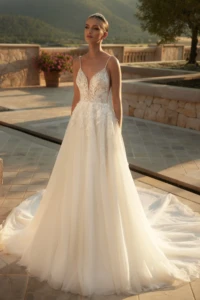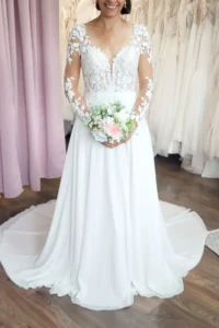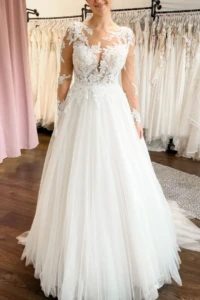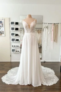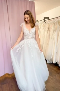 A-Linien Kleider sind die Klassiker unter den Brautkleidern, denn sie schmeicheln nahezu jeder Figurform und setzen Dich typgerecht in Szene. Es gibt sie mit Tüll und Chiffonröcken, mit oder ohne Spitzenverzierung, mit Glitzerelementen oder relativ clean gehalten. Bereits kleine Variationen der Verzierung oder der Ausschnittform genügen, damit die A-Linien-Kleider die von Dir gewünschte Wirkung erzielen. Sie sind auch für schwangere Bräute in den ersten Monaten der Schwangerschaft gut geeignet.