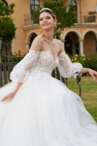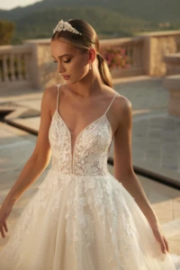 Prinzessinnenkleider sind der wahr gewordene Traum eines märchenhaften Auftritts. Tülliges Volumen mit Glitzer, feinen Verzierungen und filigrane Spitze sind die charakteristischen Details des romantischen Brautkleides im Prinzessinnenlook. Dazu lassen sich schimmernde Schuhe, funkelnder Schmuck und ein Diadem kombinieren. Meist kommt ein Schleier zum Einsatz, der den einzigartigen Charme des Kleides unterstreicht und die Braut an ihrem großen Tag strahlen lässt.